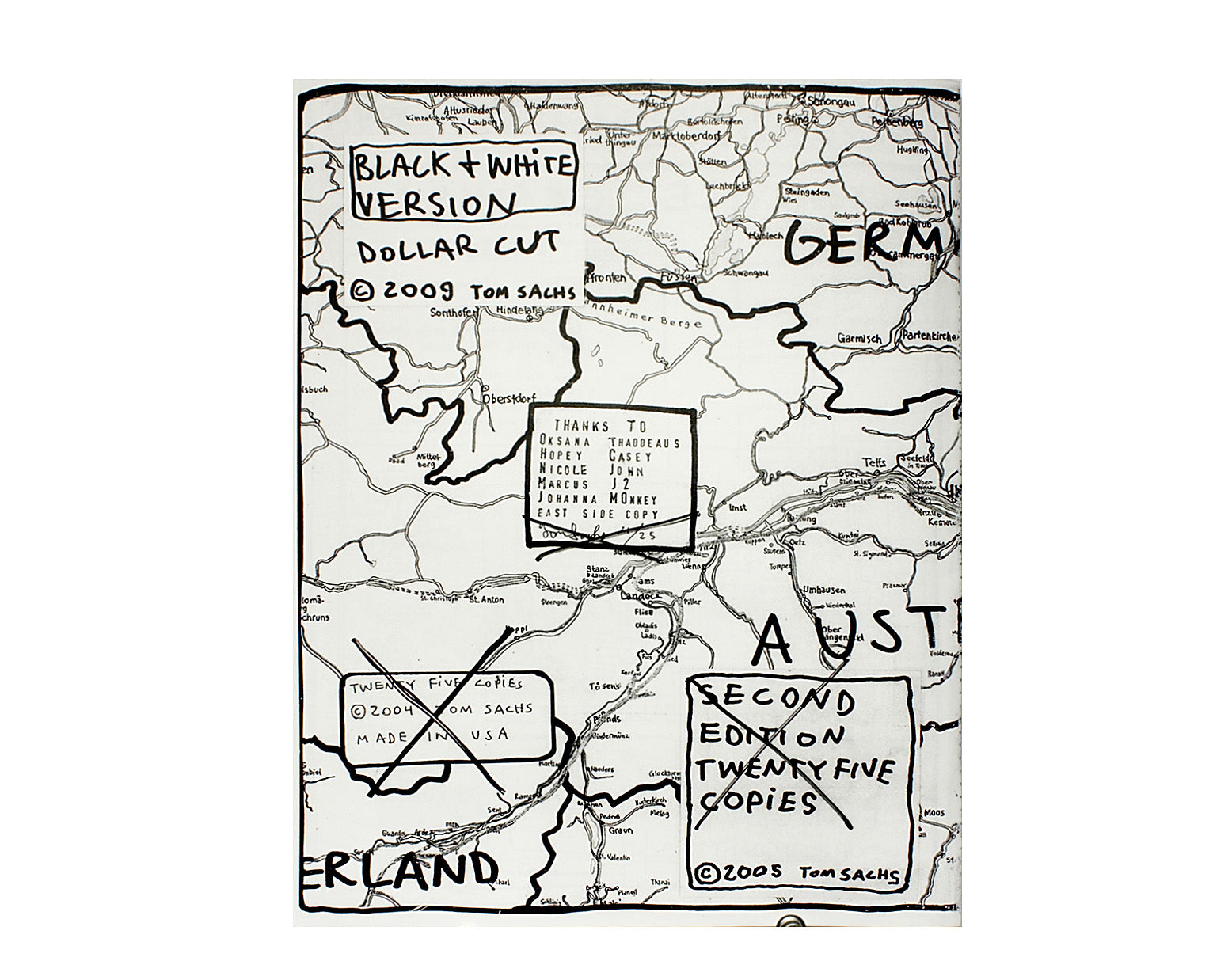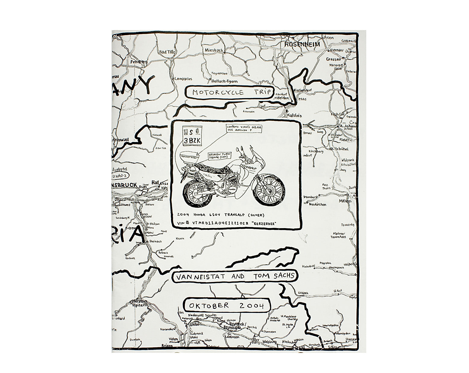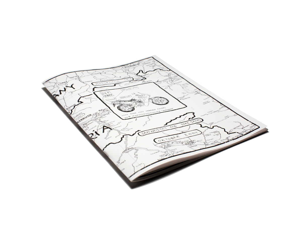 In 2004 Tom Sachs and Van Neistat made a limited edition full color zine detailing their journey through the Swiss Alps on Honda Transalp motorcycles. Full of detailed drawings and diagrams, this black and white laser copy version is just about as good as the original and a fraction of the price.