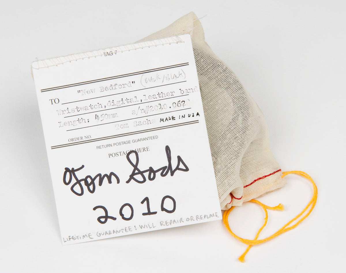 The New Bedford watch wraps twice around your wrist, a la Hermés double-tour watches. Sachs extended the existing rubber strap with a leather band, which is scraped, tanned, trimmed, and stitched by hand to fit your wrist comfortably and securely.